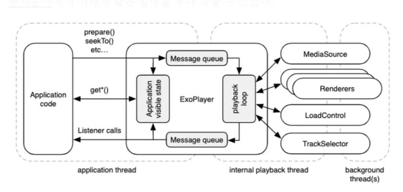 - 그래서 ExoPlayer와 같은 미디어 플레이어가 애플리케이션 스레드에서 재생되지 않도록 설계되어 있어. 대신 재생 관련 작업은 별도의 **내부 재생 쓰레드(Internal Playback Thread)**에서 이루어져. 이렇게 하면 애플리케이션 스레드는 부드럽게 UI를 계속 관리할 수 있지.